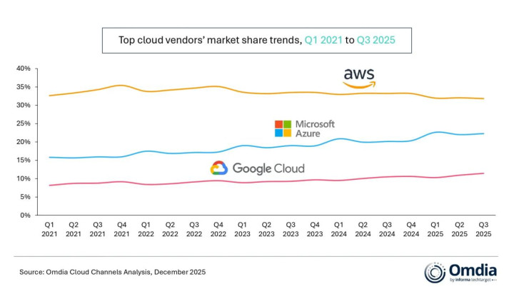 2025年第三季度,AWS、微软Azure和谷歌云保执了与上一季度相通的市集名次,三者整个占大家云基础要领支拨的66%。这三大超大限制云处事商整个散伙了29%的同比增长。