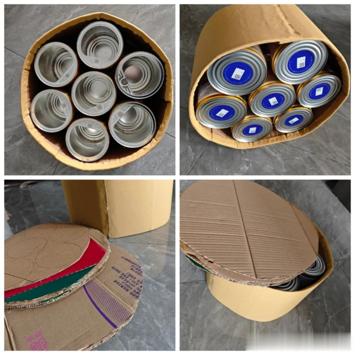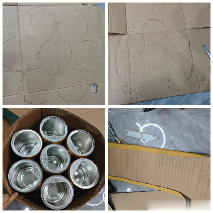 把纸壳剪裁一下,再把奶粉罐固定在纸壳上头,侧面用纸壳陆续包裹起来。
