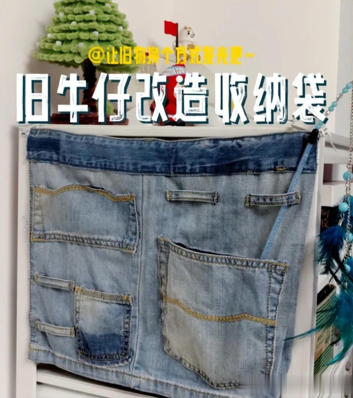 在剪裁一大块牛仔裤布料,把这些口袋缝在布料上,在装配一个袋子,挂着未便是收纳袋吗?
